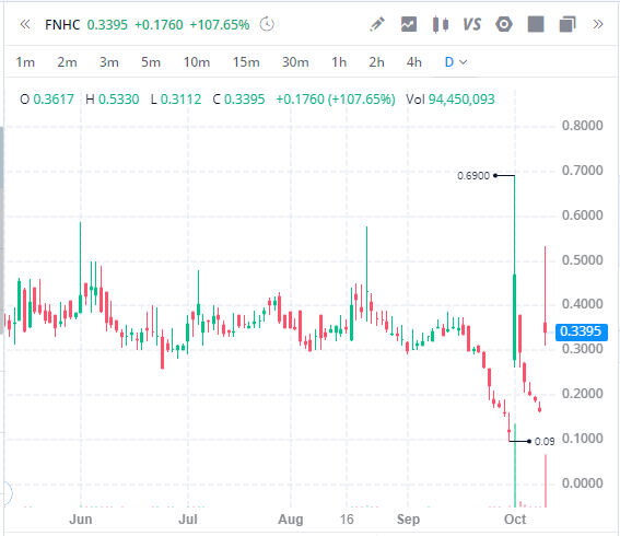 FNHC와 관련한 소식은 찾을 수가 없었습니다. 일봉상으로 봤을때는 거의 다 뒤져가다가 한번씩 튀어오르는 느낌입니다. 10월3일에도 300%정도 상승했었습니다. 이렇게 보면 엄청나게 오른 것 같은 느낌이 듭니다.