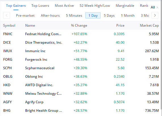 어제의 미국시장 탑게이너입니다. 그 전날보다는 탑게이너에 있는 종목들이 높은 상승률을 나타내고 있습니다. 바이오, 중국회사들이 아닌 Fednat Holding Company가 107%로 탑게이너 최상단에 위치했습니다. FNHC이외에도 10월 10일에 56.57%올랐던 IMUX가 11일에도 51%올랐네요. 자료가 하나둘씩 쌓이다보니 탑게이너 리스트에도 어디서 본듯한 종목들이 하나씩 눈에 들어오고 그럽니다.