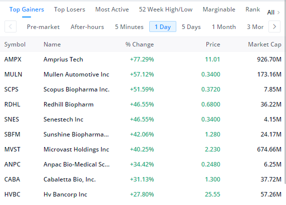 나스닥 다우지수는 0.33%가 하락했습니다. 사흘만에 하락했습니다. 그래서인지 몰라도 탑게이너에서 어제와 그저께처럼 100%넘는 상승을 보여주는 종목은 없습니다. 그래도 저번주처럼 30%도 안되는 종목들이 대부분인 경우와 다르게 어느정도의 상승률을 보여주고 있습니다. 탑게이너라는 특수한 성격의 리스트라서 그런지 몰라도 늘 바이오 종목이 많은데 어제의 탑게이너 리스트에도 바이오 종목들이 많이 보입니다. 그와중에 최상단에 위치한 AMPX는 Tech를 달고 있어서 어떤 종목인지 흥미가 생깁니다. 바이오 관련 종목들의 세상에서 최상단을 차지한 AMPX는 어떤 회사인지 한번 살펴보도록 하겠습니다.