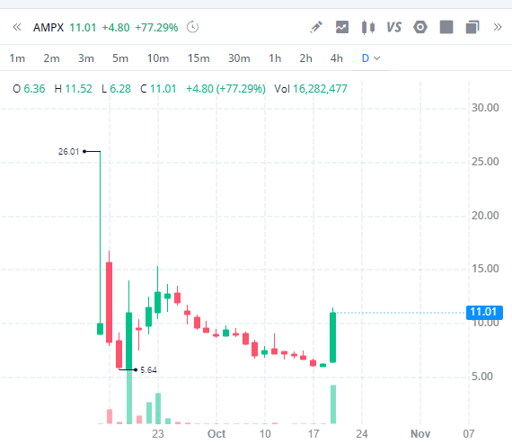 AMPX는 2022년 9월 15일에 상장된 주식입니다. 상장초기에 등락이 어느정도 있다가 10월 19일에 77% 상승했습니다. 이러한 상승을 이끌어낸 이벤트는 무엇일지 살펴보겠습니다.