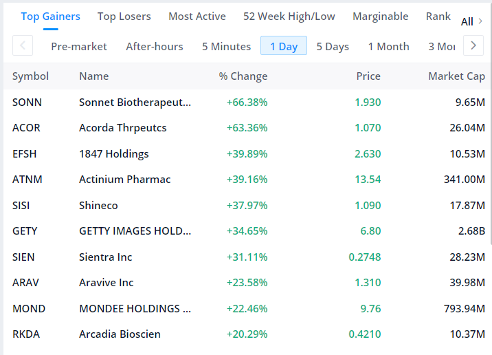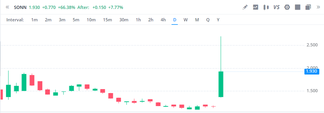 10월의 마지막날에 다우지수가 주춤하는 것처럼 탑게이너에서도 어제와 같은 급상승 종목은 보이질 않았습니다. 그래도66%가 오른 SONN에 대해 살펴보도록 하겠습니다.