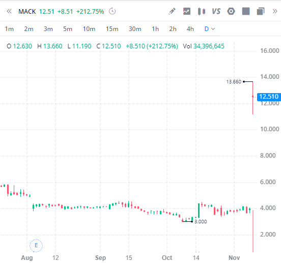 탑게이너에서도 이러한 여파 때문인지 MACK를 제외하면 30%도 안되는 종목들로만 올망졸망 모여있습니다. 이러한 상황에서 212%라는 상승률을 보여주는 MACK는 뭔 회사인지와 왜 올랐는지에 대해 살펴보겠습니다.