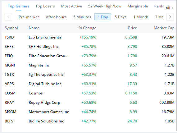 이러한 추세에 힘입어 탑게이너에서도 그 전날의 30%도 못미치는 종목들이 대부분인 것과 대조되게 상위 10종목이 모두 40%넘는 상승세를 보여주고 있습니다. 오늘은 그 중에서도 최상단에 위치한 FSRD에 대해 살펴보려고 하는데, FSRD는 Fast Radius입니다. Webull에서는 Ecp Environmental로 표시되는데 2022년에 ECP와 Fast Radius와 사업 결합을 해서 그런 것 같습니다. 네이버 증권과 Investing.com에서는 Fast Radius로 표기되어 있기 때문에 Fast Radius라고 하겠습니다.