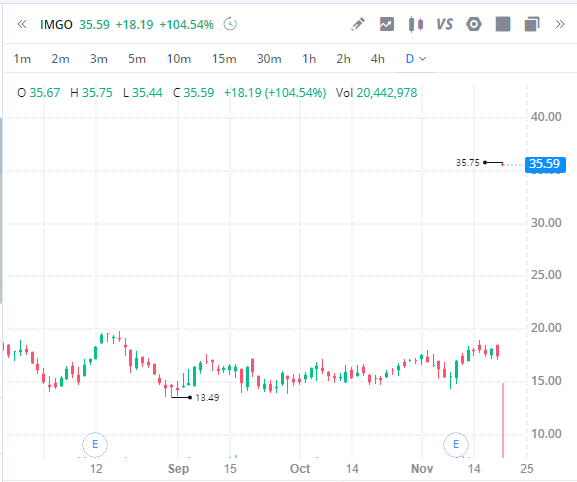 11월21일 뉴욕증시는 다우지수와 나스닥지수가 하락한 상태로 장을 마감했습니다. 다우지수는 0.13%, 나스닥지수는 1.09%하락했습니다. 탑게이너에서도 IMGO를 제외하고서는 나머지 종목들은 40%나 30%의 상승을 보여줍니다. 40%대의 종목들 중에서 단연 눈에 띄는 104.54% 상승한 IMGO에 대해서 살펴보도록 하겠습니다.