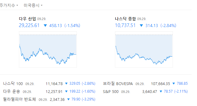 어제 미국증시는 난리가 난듯합니다. 이게 머선일이고 싶어서 지수를 살펴봤더니...